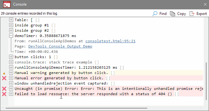 The Console window has been significantly enhanced to provide more useful debugging information. Console entries can now display additional metadata such as timestamps and stack traces in a foldable format: