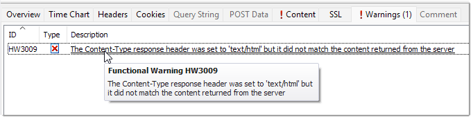 HttpWatch now detects cases where a server returns content with an incorrect content type or content header. New warnings, HW3009 and HW3010, highlight these problems and help identify server-side misconfigurations more quickly: