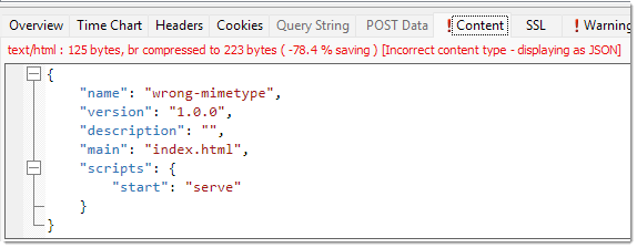 When common content types such as HTML, JavaScript, CSS, JSON or XML are detected with the wrong MIME type, HttpWatch will also apply the appropriate formatting and display a warning icon in the Content tab: