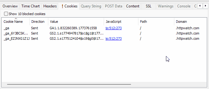 HttpWatch can now capture cookies that are assigned through JavaScript as well as cookies sent and received through HTTP headers. This makes it much easier to diagnose authentication problems, consent issues, tracking bugs and other client-side behaviour that would previously have been harder to trace.